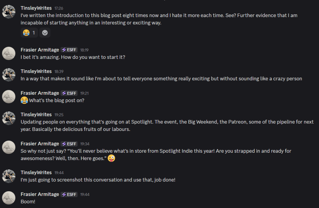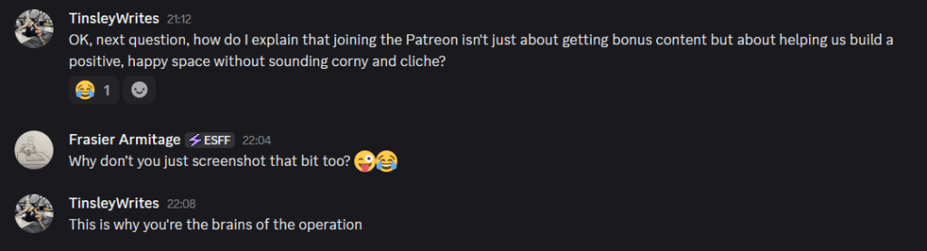 Now, I could wax lyrical about the benefits of joining – the behind-the-scenes updates, announcements about our events, our expanding library of short stories by our favourite indie authors, access to our exclusive Discord and the Patreon-exclusive AMAs and workshops (am I selling this yet, Tim?). But I won’t.